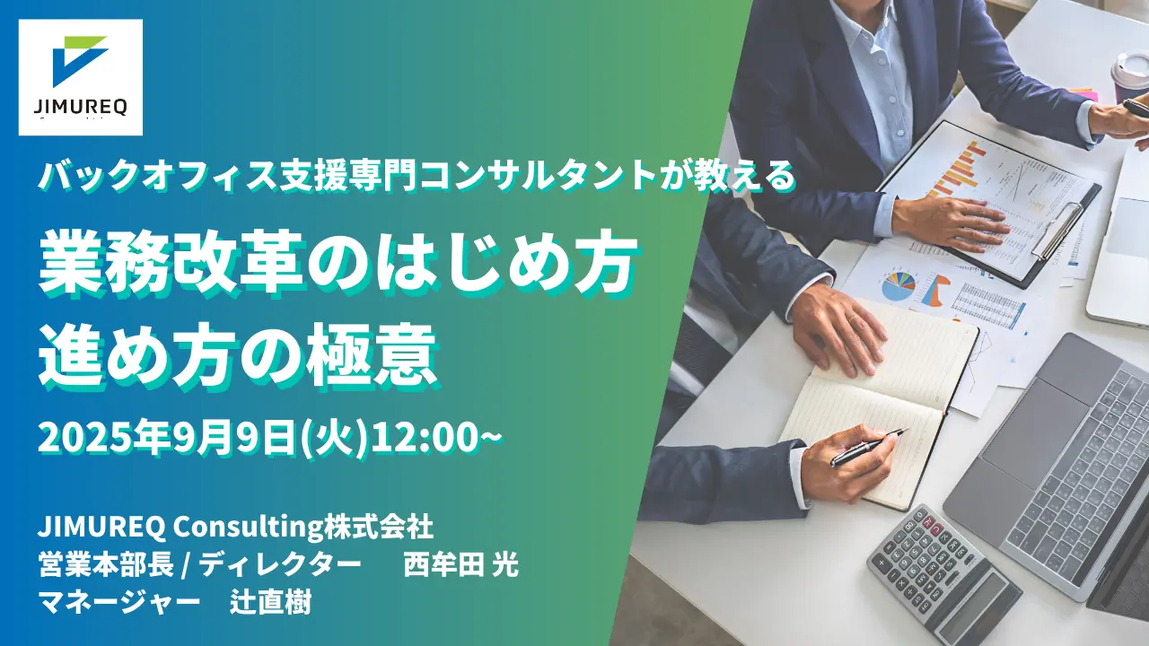 JIMUREQ Consulting株式会社(本社:東京都中央区、代表取締役:平野 涼)は、『バックオフィス支援専門コンサルタントが教える、業務改革のはじめ方・進め方の極意』セミナーを開催いたします。バックオフィス部門の方や業務改善・DXを検討されている方は必見の業務改革のはじめ方・進め方の極意をご紹介いたします。